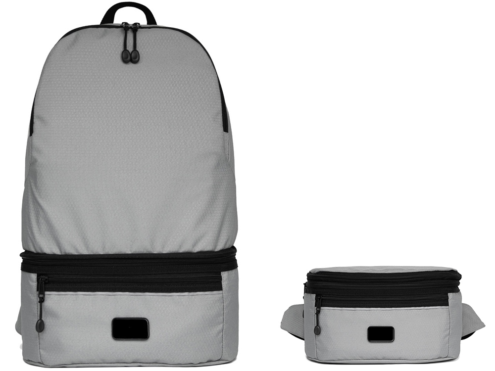 Легкий рюкзак и поясная сумка 2-в-1 станет отличным корпоративным подарком. Рюкзак с таким функционалом удобен для поездок, походов на работу или в спортзал. Поясная сумка, прикрепленная к рюкзаку с помощью молнии, добавляет 6 л к общему объему рюкзака, делая его более вместительным. Спереди светоотражающий элемент для дополнительной защиты в темное время суток. Лямки регулируются по длине. Водостойкий материал. Комплектуется съемным металлическим шильдом под нанесение вашего логотипа.