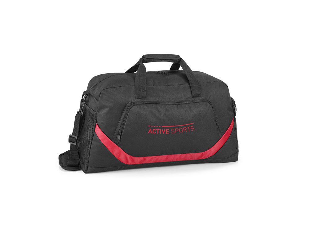 Сумка спортивная из полиэстера 300D и 1680D с внутренней подкладкой и полу-жестким дном. В сумке есть 1 передний карман с молнией и 2 боковых: из сетки и для обуви с замком. Регулируемая плечевая шлейка с набивкой. Вид нанесения, рекомендуемый поставщиком: вышивка, трансфер