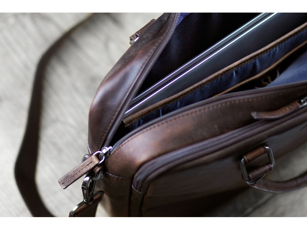 Деловая сумка EARL имеет два основных отделения, которые закрываются с помощью двухсторонней молнии, 1 карман для мобильного телефона и 2 отделения для ручек. В дополнение к большому основному отделению во внутреннем кармане есть также отделение для ноутбука.