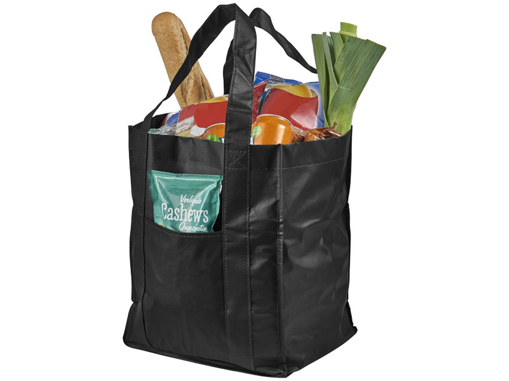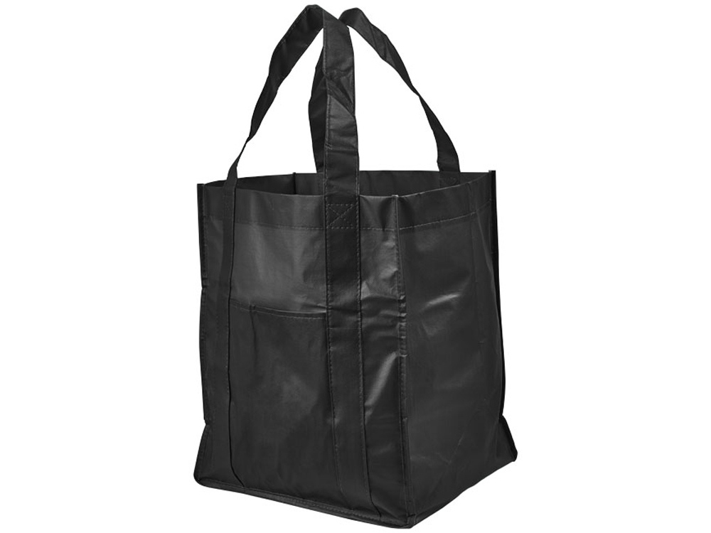 Ламинированная сумка для покупок. Открытое основное отделение. Ламинированный материал водонепроницаемый и легко моется. Передний карман. Высота ручек 23 см. Ламинированный нетканый полипропилен 80г.