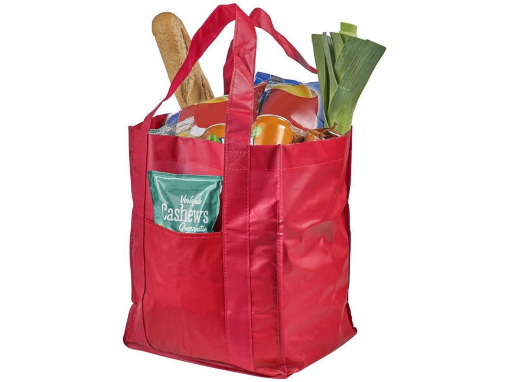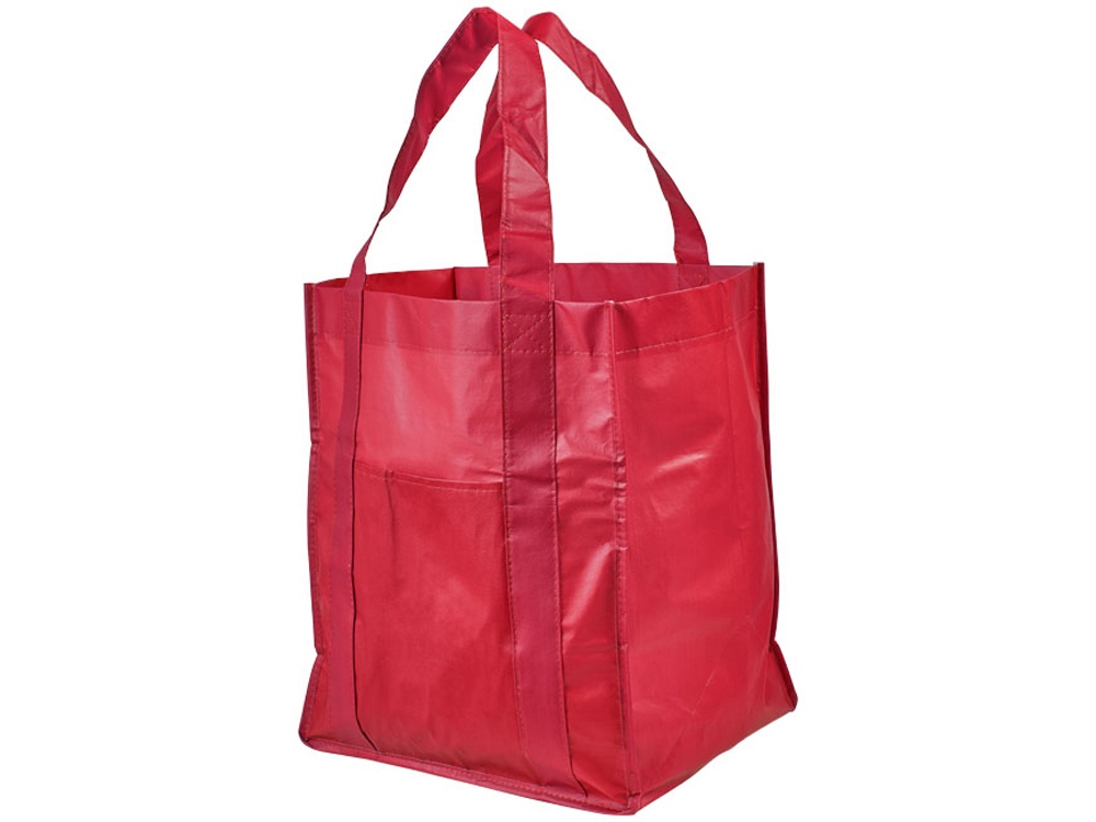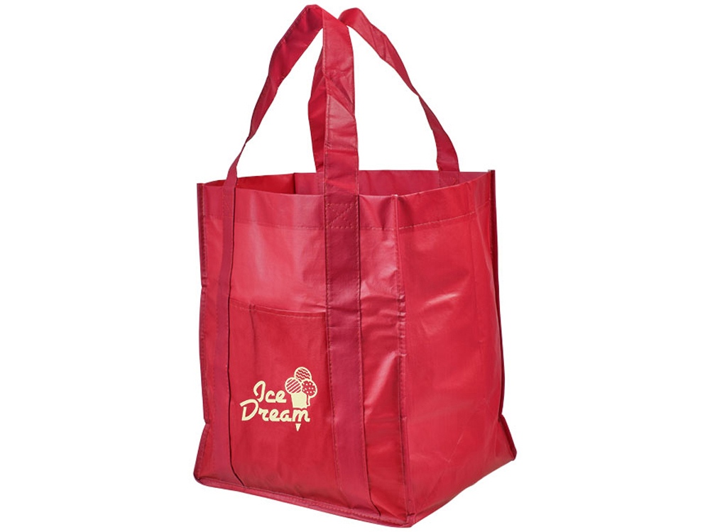 Ламинированная сумка для покупок. Открытое основное отделение. Ламинированный материал водонепроницаемый и легко моется. Передний карман. Высота ручек 23 см. Ламинированный нетканый полипропилен 80г.