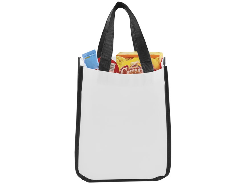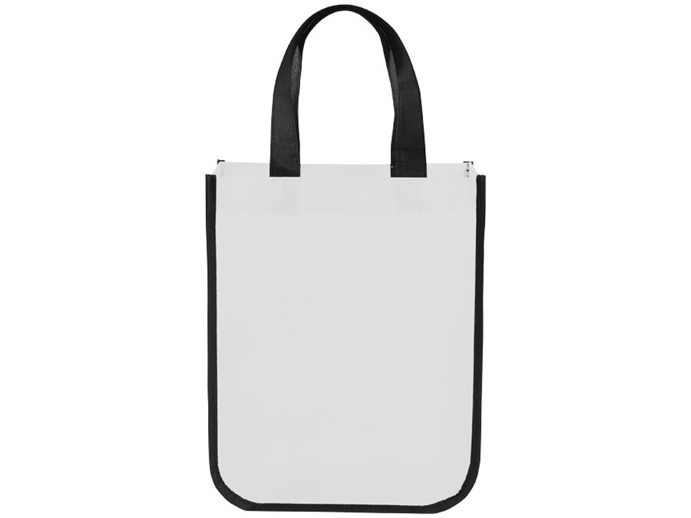 Маленькая ламинированная сумка для покупок. Открытое основное отделение. Ламинированный материал не пропускает воду и его легко чистить. Высота ручек 15,5 см. Ламинированный нетканый полипропилен 80г. Трафаретная печать (1 цвет (цветные изделия)) на данный товар осуществляется бесплатно. Оплачивается только настройка оборудования в размере 8700 рублей на весь тираж.