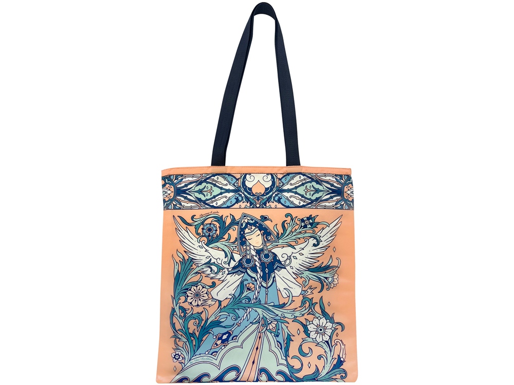 В центре авторского принта — удивительной красоты женщина с белоснежными крыльями, наделенная магическими способностями и житейской мудростью. Оригинальное сочетание тонов, цветочных орнаментов и русского колорита делают аксессуар нежным и самобытным.