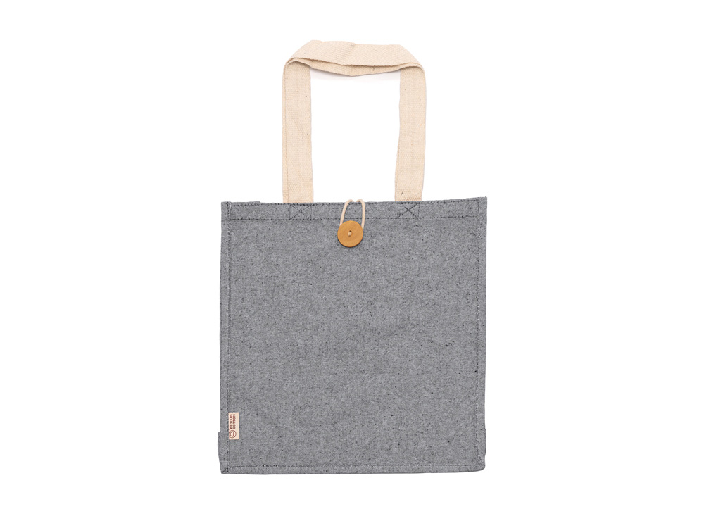 Сумка из переработанного хлопка с отделкой цвета вереска. Усиленные ручки длиной 70 см. Застежка на пуговицы.