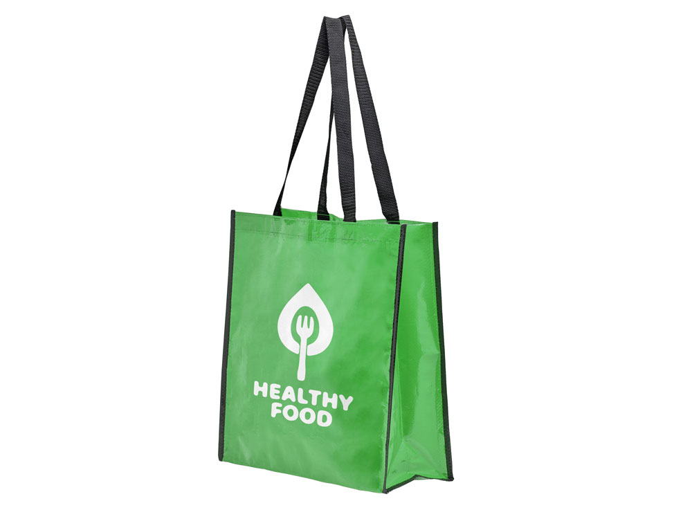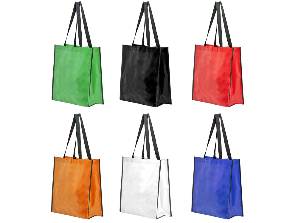 Сумка многоразового использования с глянцевой ламинированной отделкой. Прочный материал с ручками из усиленного нейлона и соответствующей черной окантовкой.