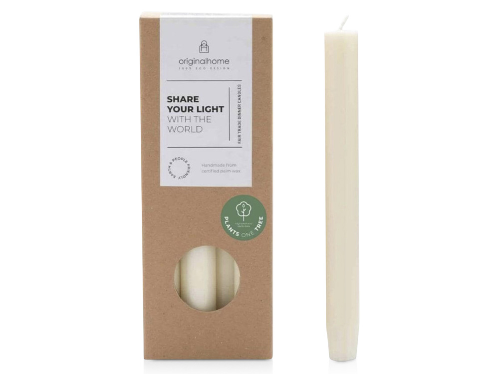 Столовая свеча от Originalhome на 100% натуральная и изготовлена вручную из сертифицированного пальмового воска. В комплект входят 10 свечей без запаха, упакованных в крафтовую коробку. Каждая свеча горит примерно 7-8 часов.