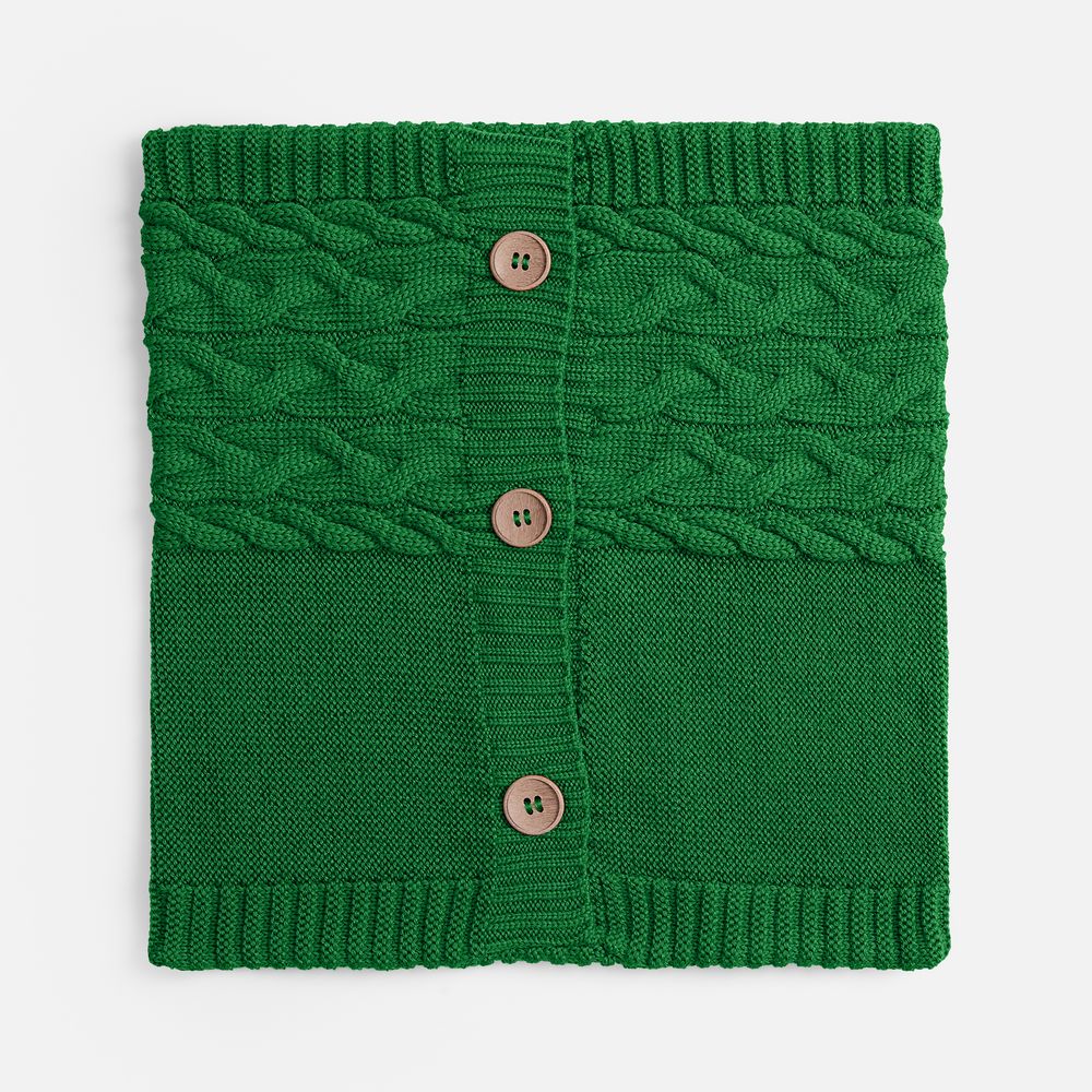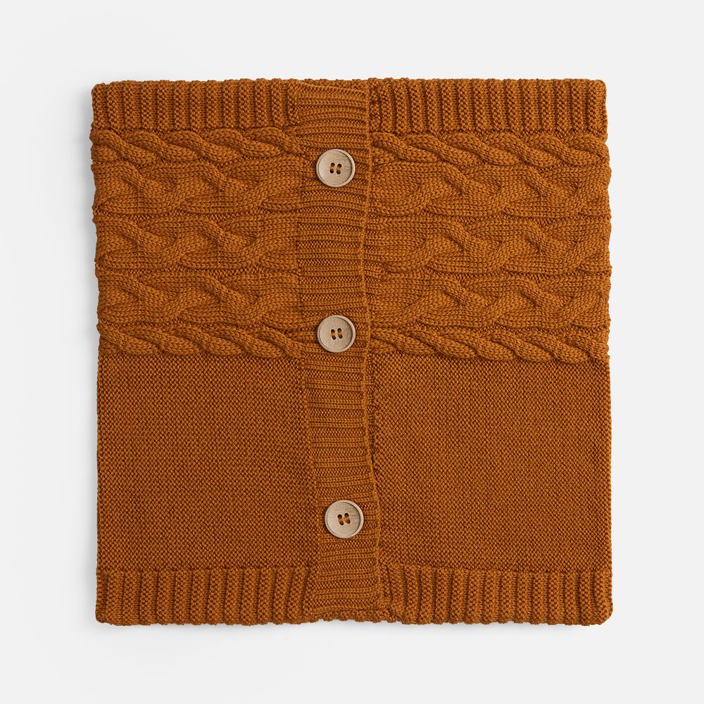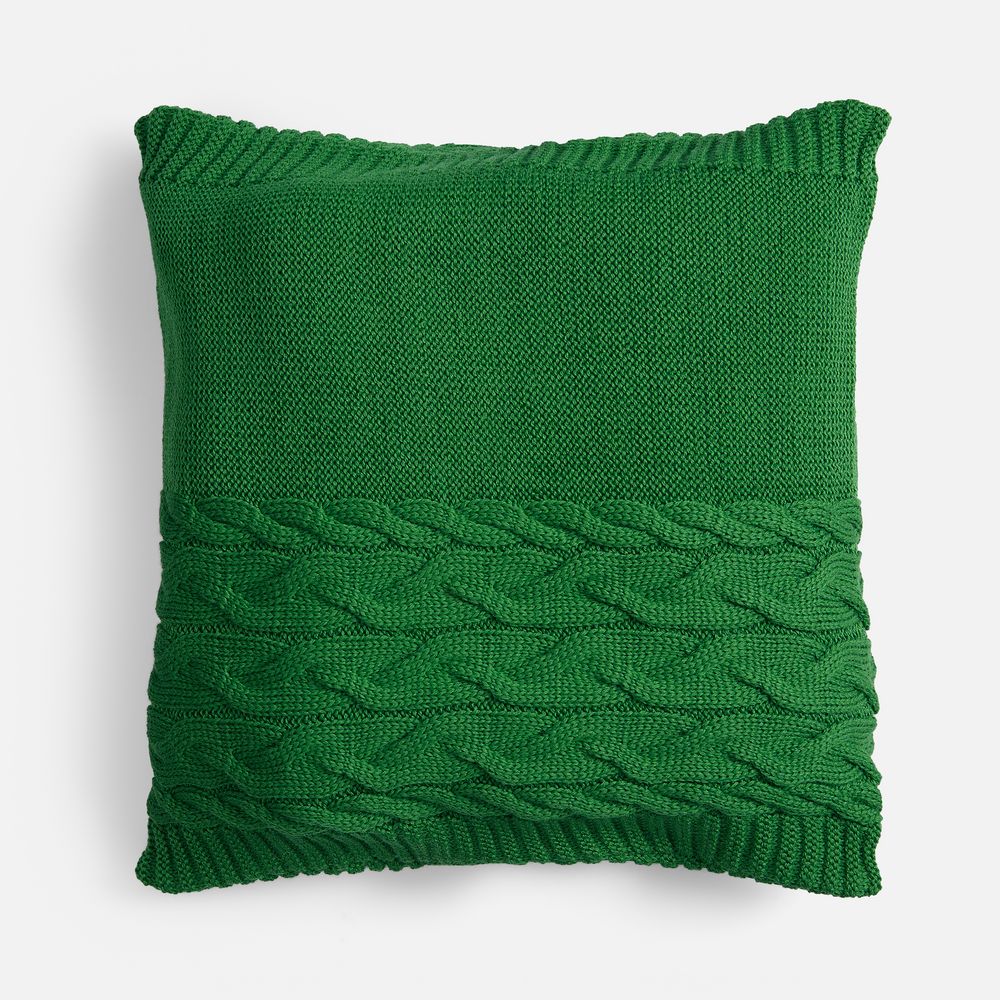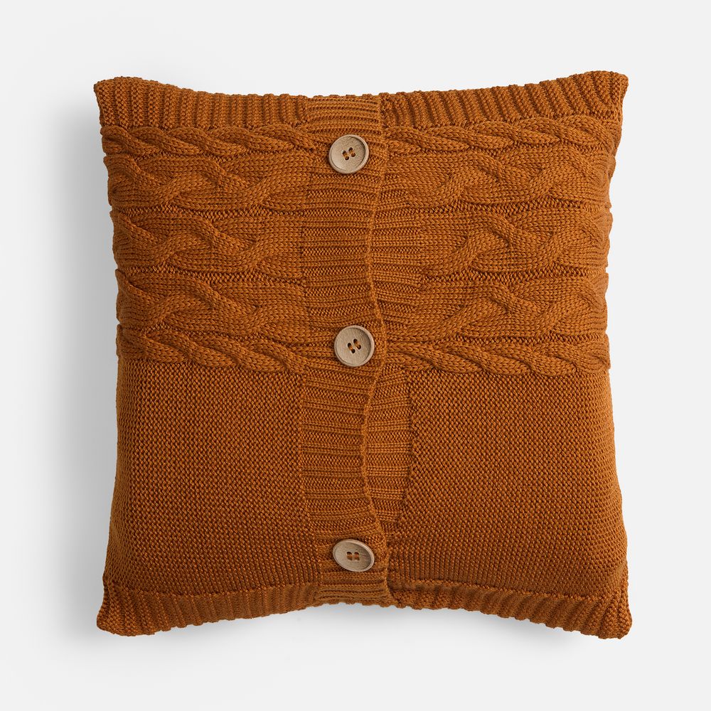 Вязаный чехол надевается на подушку из спанбонда, наполнитель — синтепон. Чехол крепится на три пуговицы.