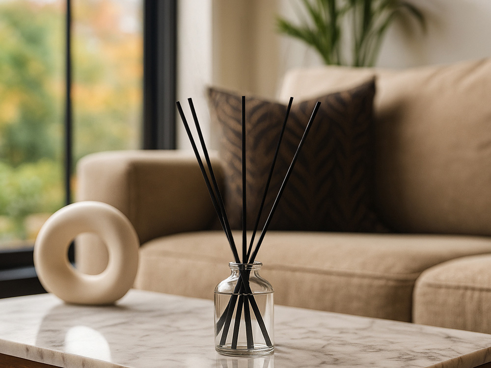 Прозрачный флакон без лишних деталей гармонично впишется в любой интерьер, а чёрные фибровые палочки обеспечат равномерное и продолжительное распространение аромата.