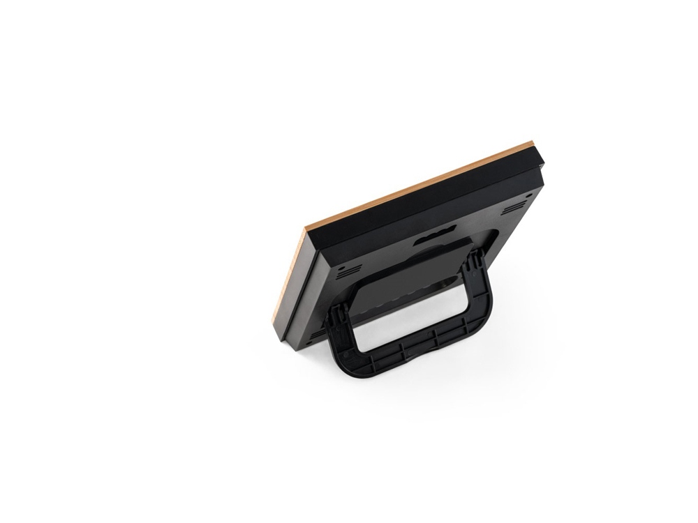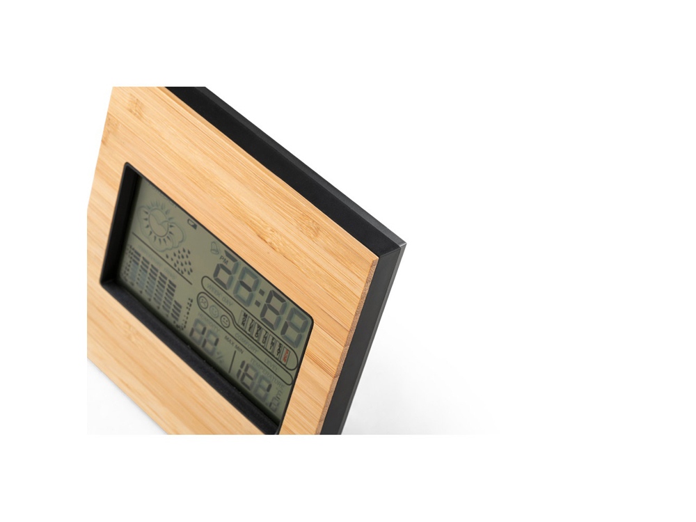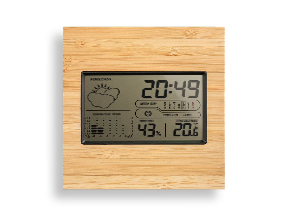 Настольная станция из ABS и бамбука со следующими функциями: часы, будильник, монитор влажности и термометр. В комплекте две батарейки ААА. Поставляется в подарочной коробке из крафт-бумаги. 130 x 130 x 21 мм