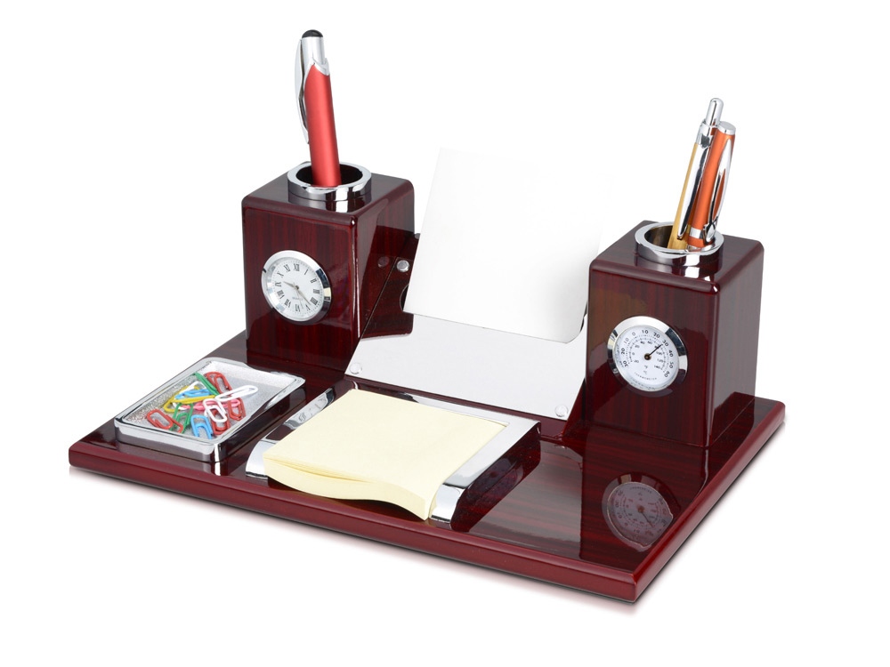 Превосходный набор из дерева благородного оттенка и металла станет отличным подарком руководителю организации. Здесь учтено все, что нужно для плодотворной работы: часы, термометр, подставки под ручки, скрепки, бумажный блок и визитки. Теперь все канцелярские принадлежности будут в порядке.