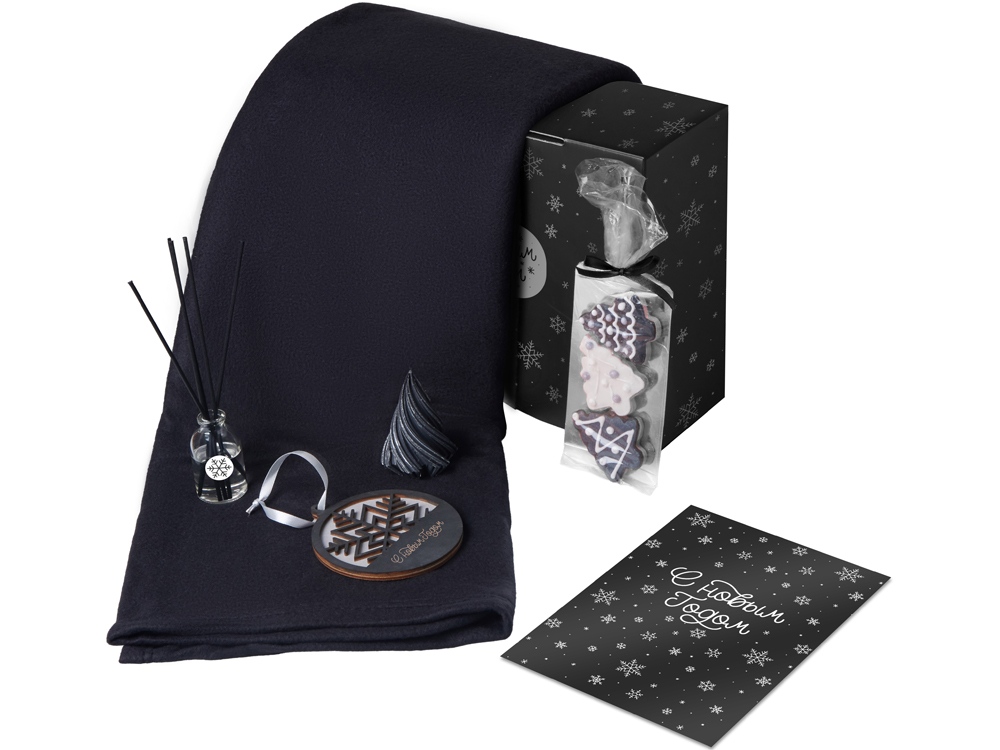 плед - флис 100% полиэстер; подвеска - березвовая фанера; открытка - бумага; мешок - нетканый материал (спанбонд)