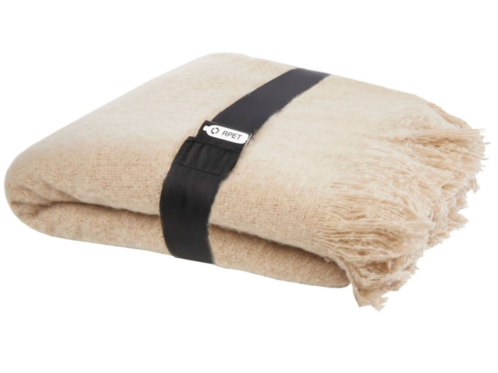 Ультрамягкий мохеровый плед из вторичного ПЭТ, обернутый лентой из вторичного ПЭТ 190T. Упаковано в полиэтиленовый пакет из переработанного материала. Длина бахромы: 10 см с каждой стороны. Размер ленты: 72 см x 4 см. 100% переработанный полиэстер, 215 g/m2.