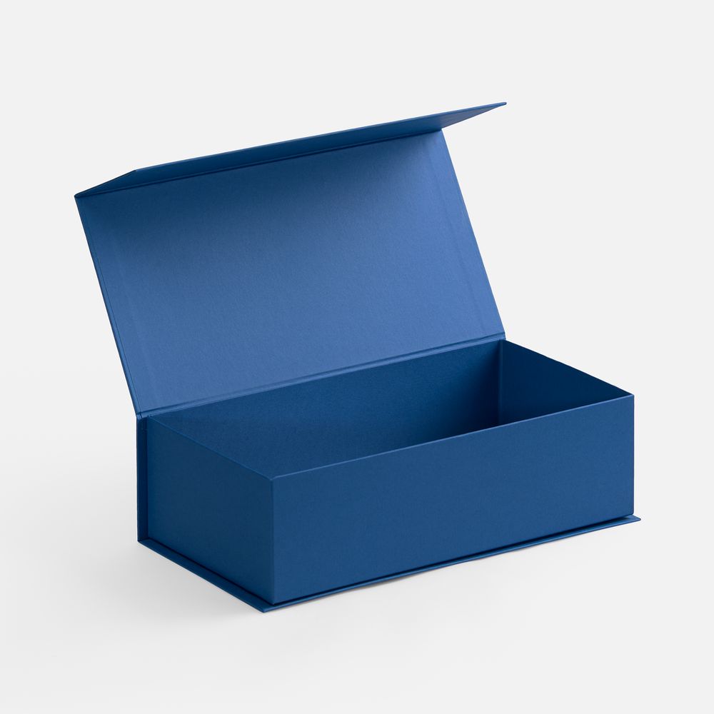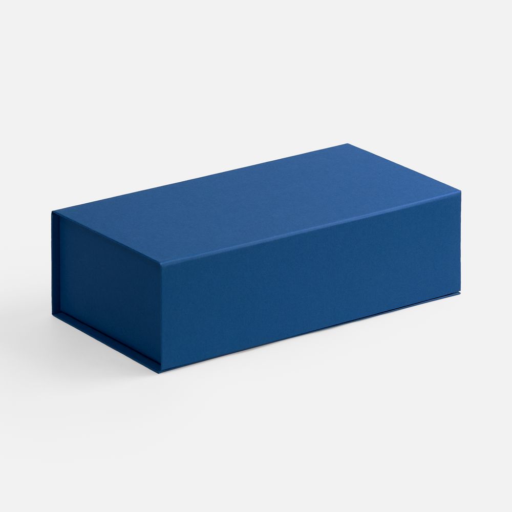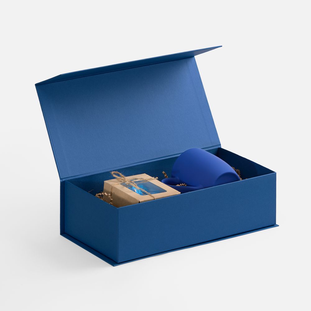 Коробка изготовлена из переплетного картона, кашированного гладкой дизайнерской бумагой Malmero «Благородный синий», с крышкой на магните.