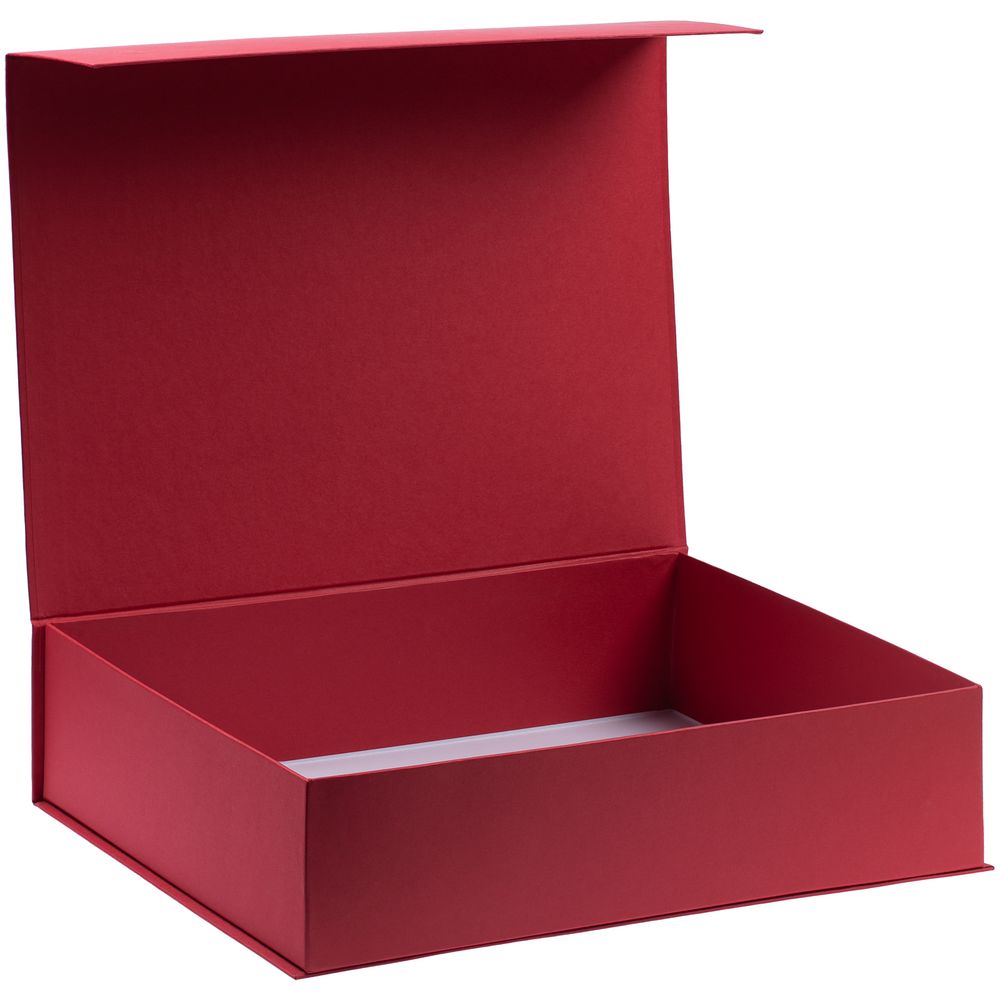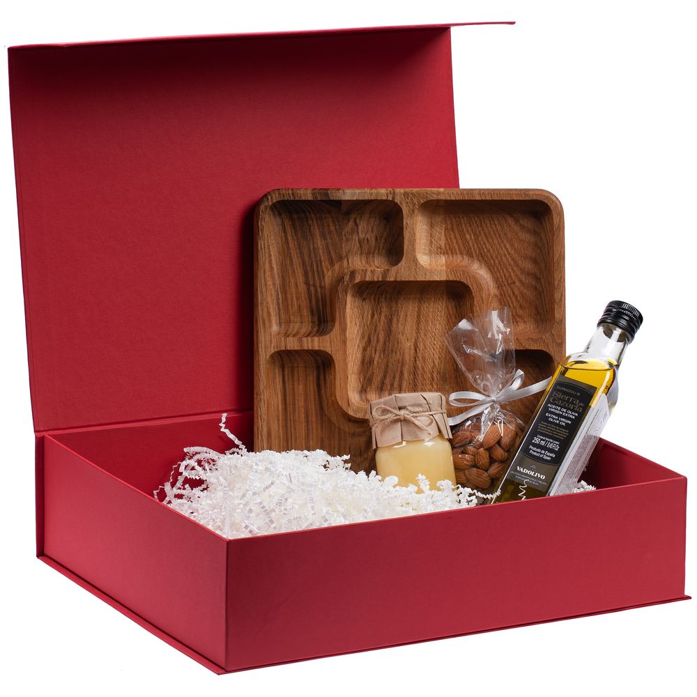 Коробка выполнена из переплетного картона, кашированного гладкой дизайнерской бумагой Majestic цвета «Золотой свет», с крышкой на магнитах.