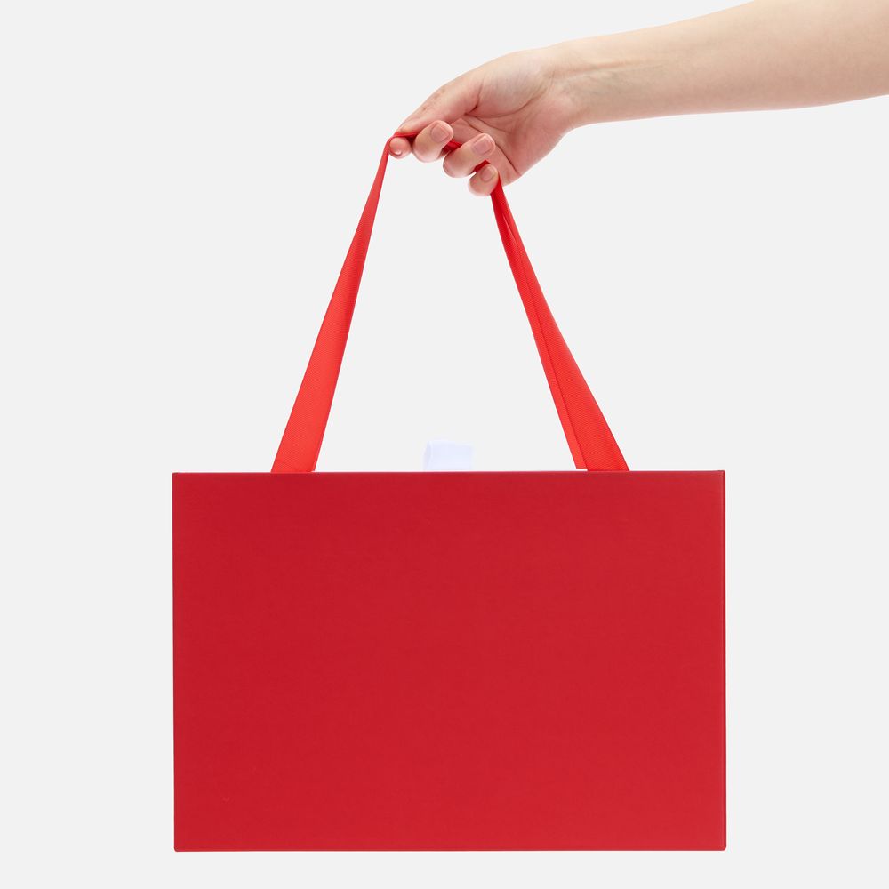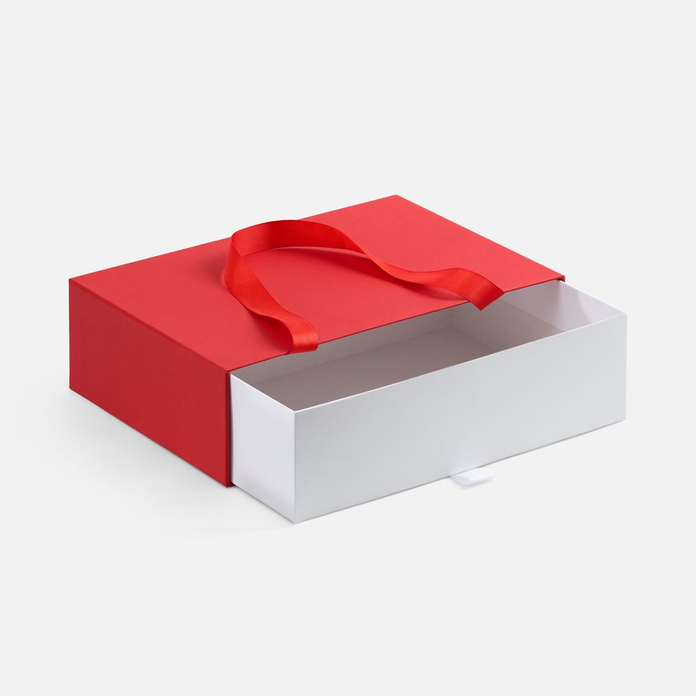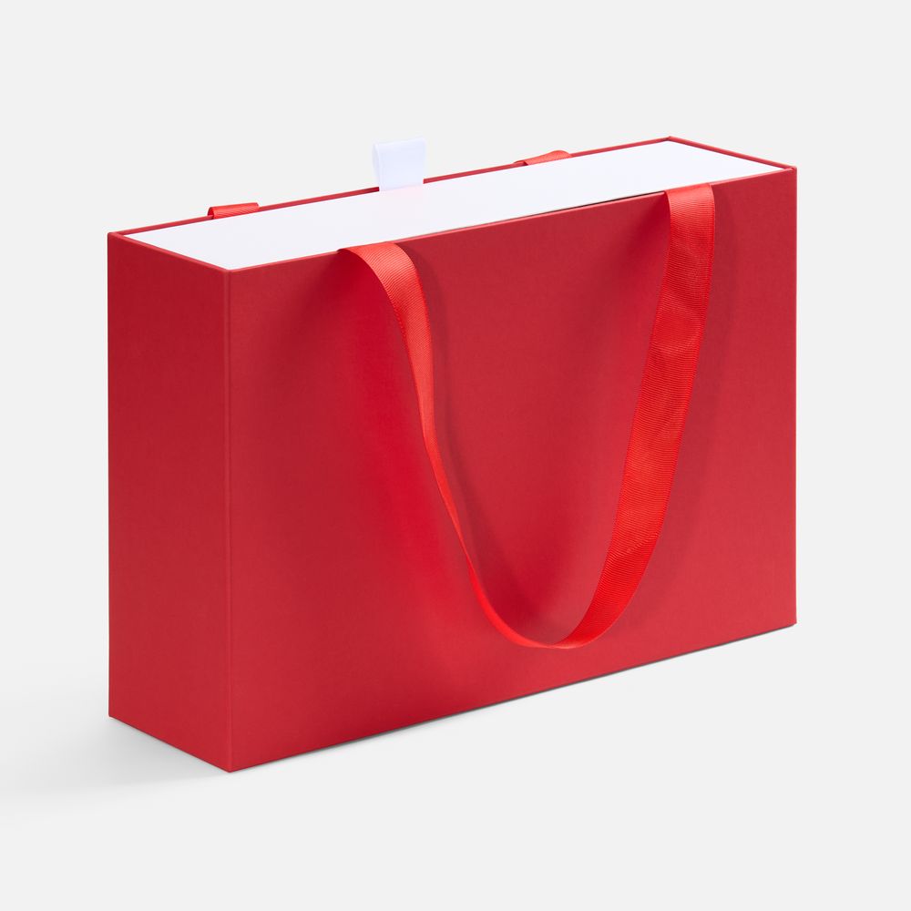 Внешний короб каширован дизайнерской бумаги и оснащен прочными ручками из репсовой ленты. Внутренний короб отделан белой бумагой, ламинированной матовой пленкой.