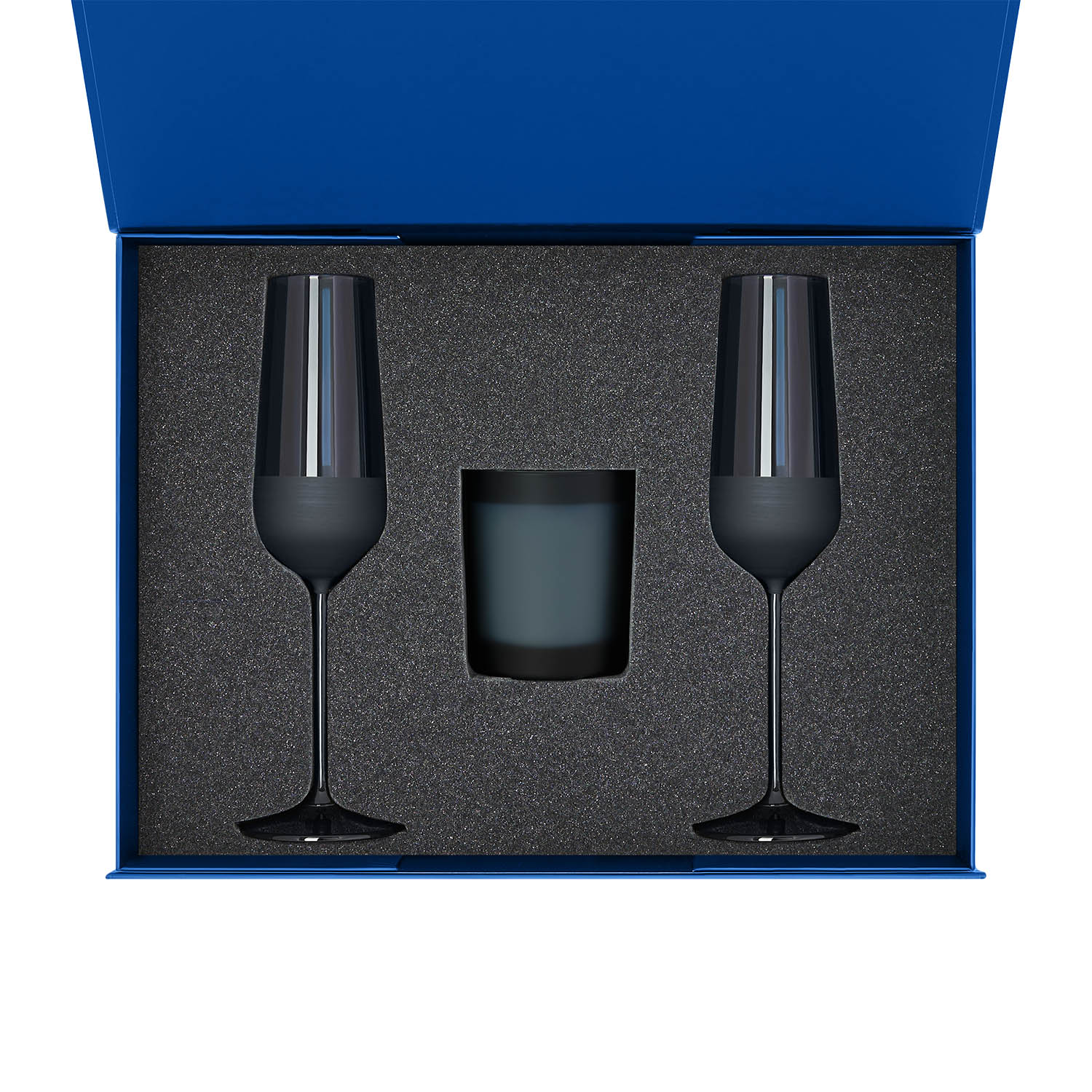 Идеальное решение для надежной и стильной упаковки двух бокалов для шампанского и свечи.