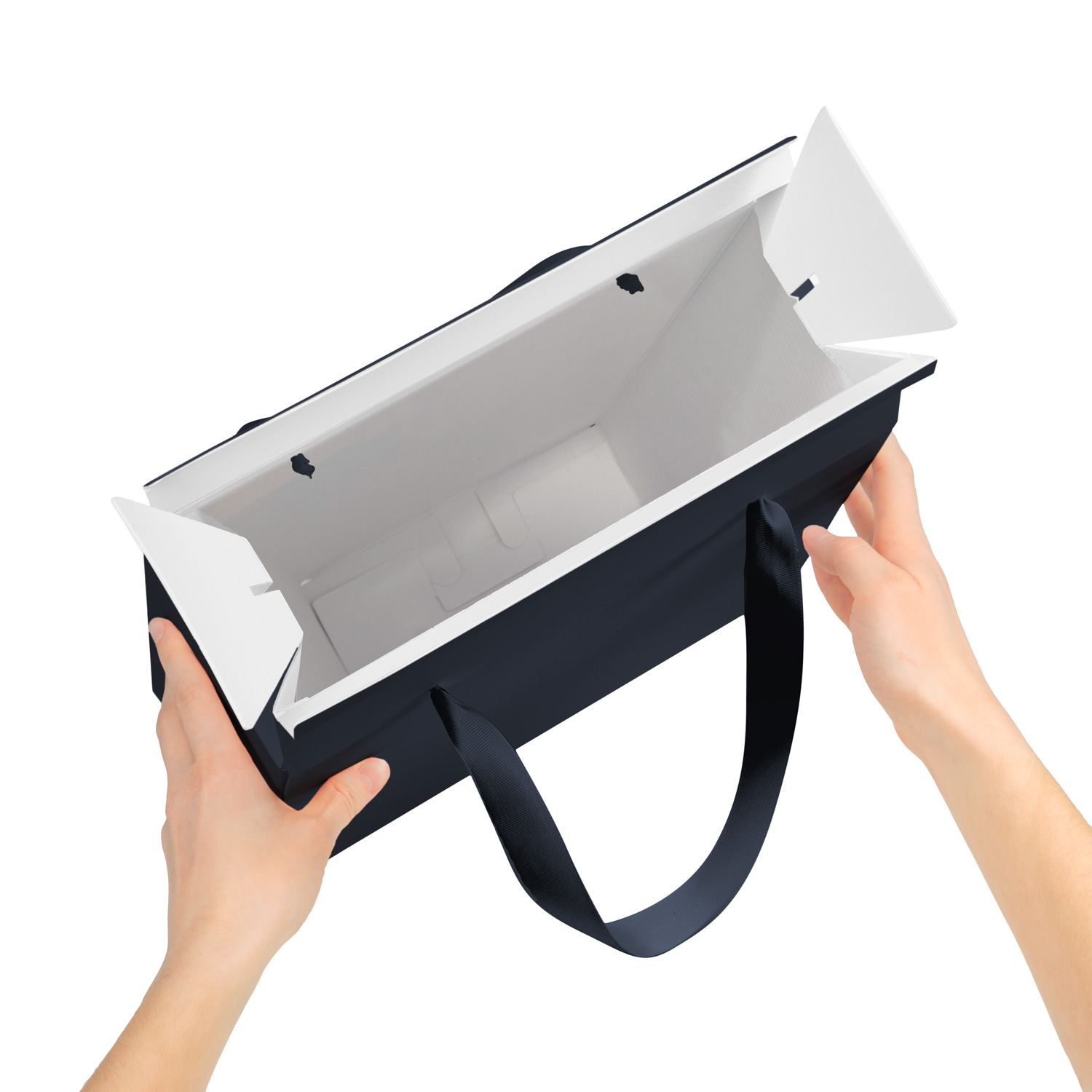 Универсальная подарочная коробка-пакет в большом размере — это идеальное решение для тех, кто ценит как эстетичный внешний вид, так и функциональность. Созданные из микрогофрокартона и кашированного мелованной бумагой, эти коробки отличаются изысканным дизайном и прочностью, что делает их идеальным выбором для упаковки подарков.