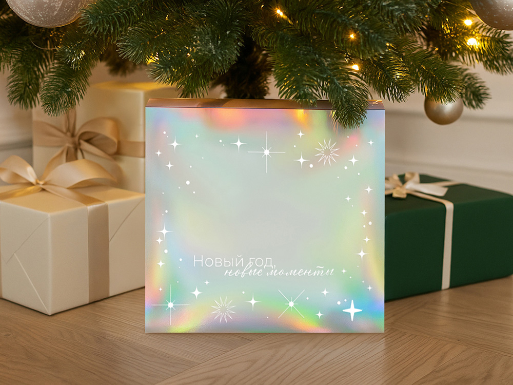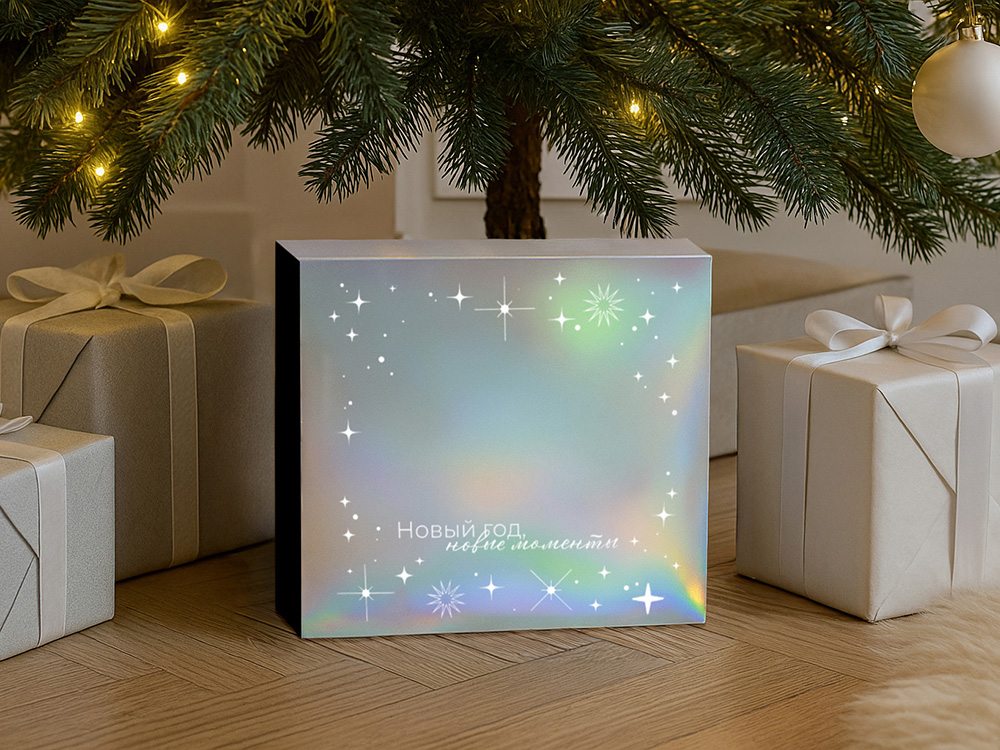 Упаковка — это первое впечатление о подарке. В преддверии Нового года особенно важно создать атмосферу праздника — стильная и аккуратно выполненная коробка с голографическим шубером сразу вызывает ощущение заботы, уюта и волшебного ожидания.